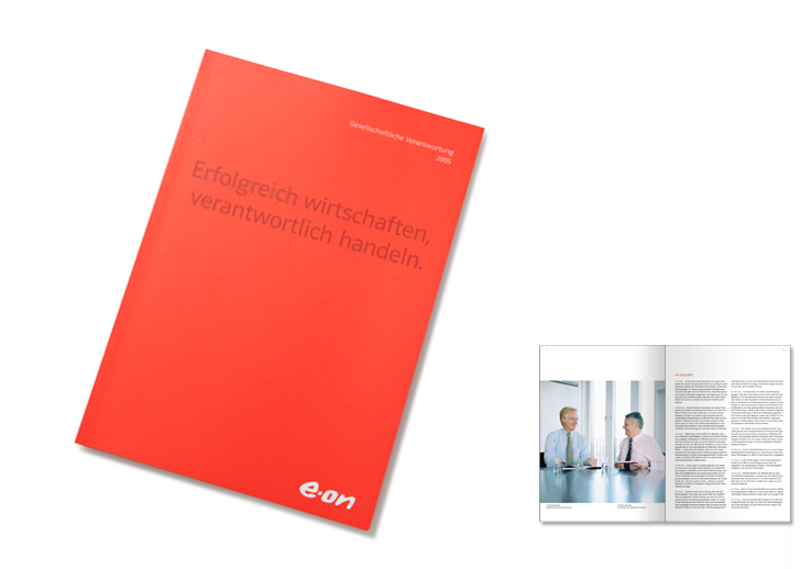 Pünktlich zum zweiten CR-Bericht wurde das Corporate-Responsibility-Programm der E.ON AG ausgerollt – und damit natürlich zentrales Thema des Berichts. Wer könnte das seinerzeit ambitionierte Programm besser kommunizieren als die Vorstände selbst? Eben. Und so haben wir fünf Vorstände porträtiert, die Beiträge zu den Inhalten des Programms lieferten: „Verantwortliche Unternehmensführung“, „Markt“, „Umwelt“, „Region“ und „Arbeitsplatz“.